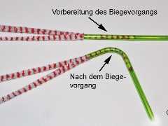 Ist die gewünschte Biegeposition erreicht, muss das Röhrchen noch einige Zeit festgehalten oder anderweitig fixiert werden, da es sich ansonsten beim Erkalten etwas zurückbiegt. Kaltes Wasser beschleunigt die Abkühlung natürlich. Ist das Material wieder fest, können die Pfeifenreiniger wieder herausgezogen werden. Das kann je nach Biegung durchaus etwas Kraft erfordern, sollte aber in jedem Fall mit der nötigen Vorsicht geschehen. Durch die Biegung ist die Wandstärke des Röhrchens verringert worden; das kann bei zu viel Gewalt schon einmal zu einem Bruch führen. Daher ist es auch ratsam, Mehrfachbiegungen möglichst nacheinander und nicht in einem Biegevorgang anzulegen.